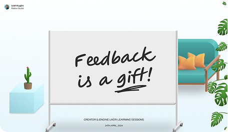 This session was designed for the Roblox Creator and Engine UXDR teams in April 2024. The core argument: feedback isn't just a performance tool — it's the mechanism through which design culture stays honest, iterative, and high-quality. Without it, designers work in a vacuum and teams drift apart.